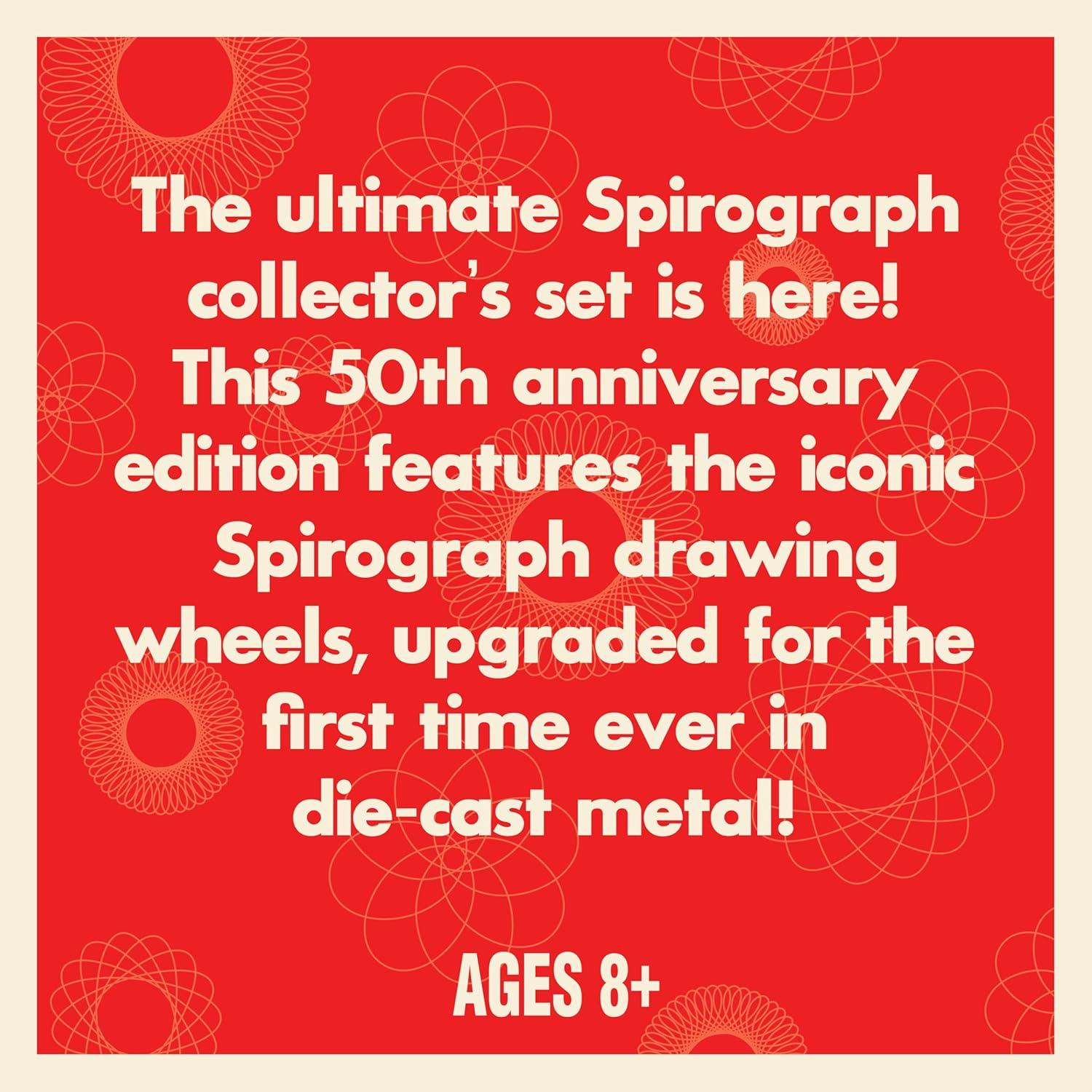 The ultimate Spirograph collector’s set is here! This 50th anniversary edition features the iconic Spirograph drawing wheels, upgraded for the first time ever in die-cast metal! With the nine golden die-cast wheels and a golden die-cast ring, you can create countless amazing designs with machine-like precision. The pieces work just like classic Spirograph sets, but with the weight and feel of a nostalgic die-cast toy. The die-cast Spirograph wheels work with the two retractable ballpoint pens included in the set as well as with most standard pens, markers and pencils. The full-color design guide explains the fundamentals of drawing with Spirograph as well as giving step-by-step instructions for creating your own designs. This golden anniversary edition comes in a collectible Spirograph display tin, making it the perfect executive set or toy collector’s must-have item. The included Spirograph putty holds the Spirograph pieces securely on the paper so that you can create intricately beautiful designs with no holes in the paper. The die-cast pieces also feature the classic Spirograph pinholes so that you may add your own map pins just like the original 1965 Spirograph. (Adult supervision required when using pins. Pins and pin board not included.)