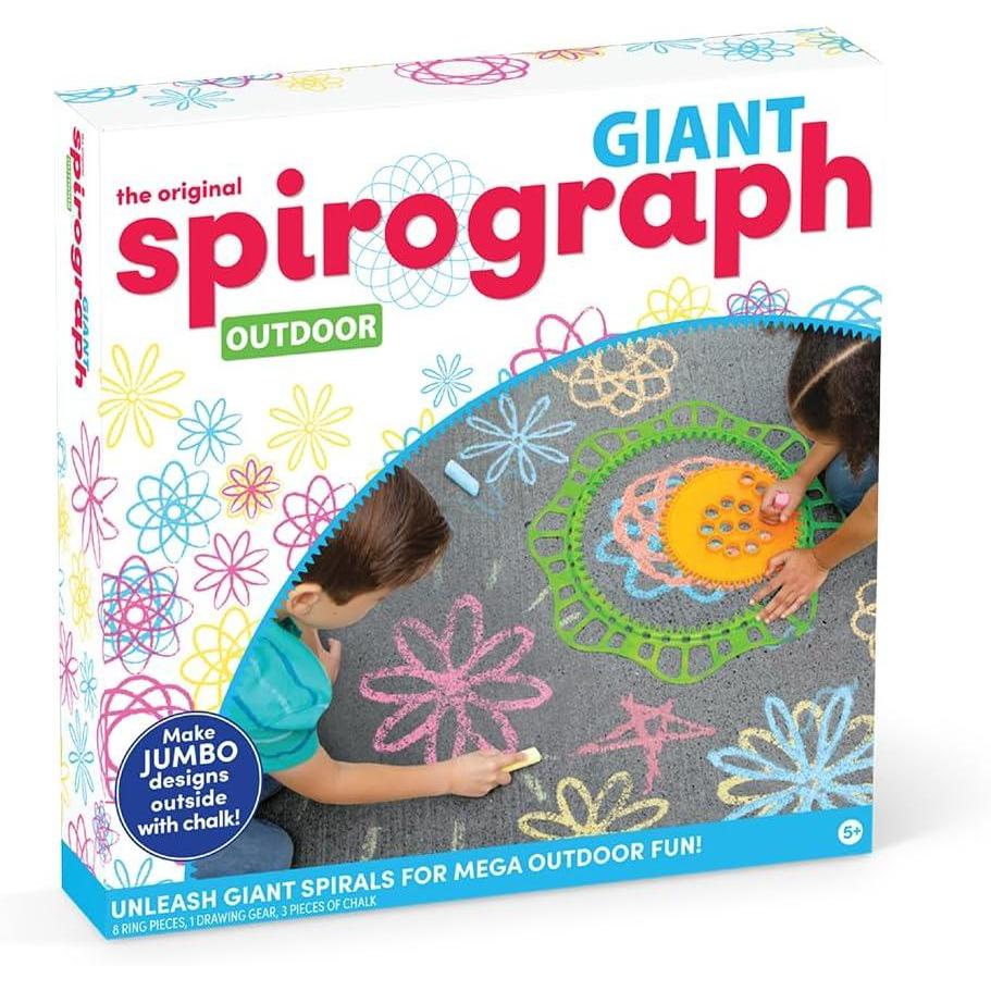 Take Spirograph fun outside! Transform your driveway or sidewalk into a giant canvas for dazzling spiral creations with chalk. The giant wheel and gear make it easy to spin out bold 15″ designs, perfect for young artists ages 5+ to let their imaginations shine. Get started right away with 3 included pieces of chalk, or grab any jumbo chalk for endless possibilities. The Giant Outdoor Spirograph sparks creativity, encourages collaborative play, and delivers hours of mess-free fun in the fresh air. Give your art a spin with Spirograph!